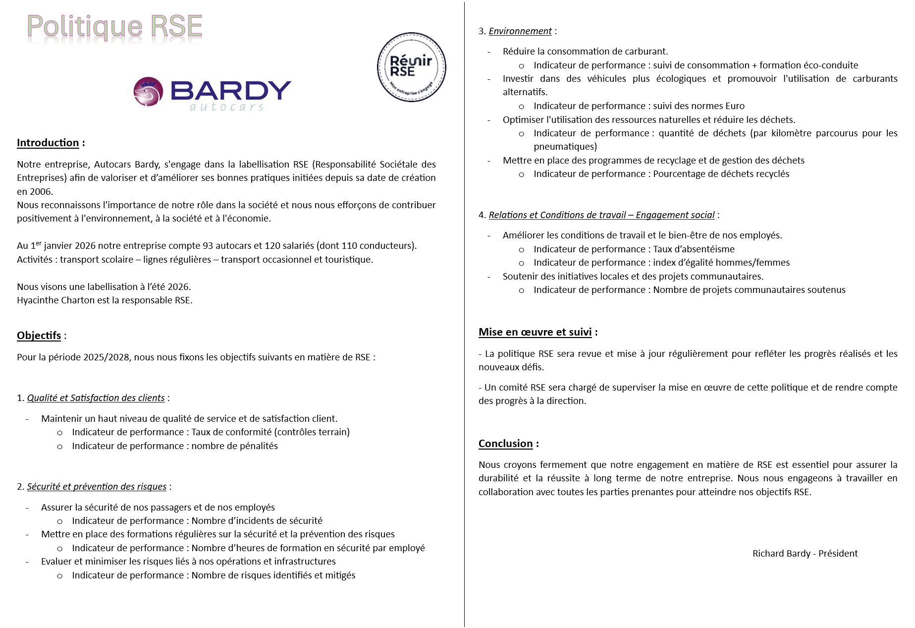 L’Entreprise Autocars BARDY s’engage dans la labélisation RSE afin de valoriser et de d’améliorer ses bonnes pratiques initiées depuis de sa date de création en 2006.
